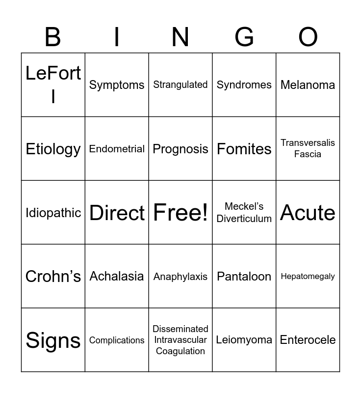 This bingo card has a free space and 31 words: Disseminated Intravascular Coagulation, Hemorrhoids, Direct, Retroflexion, LeFort I, Strangulated, Endometrial, Pantaloon, Meckel’s Diverticulum, Leiomyoma, Acute, Enterocele, Third Degree, Intussusception, Transversalis Fascia, Gynecomastia, Hepatomegaly, Achalasia, Crohn’s, Anaphylaxis, Melanoma, Cholelithiasis, Signs, Symptoms, Fomites, Etiology, Syndromes, Idiopathic, Complications, Prognosis and Relapse.