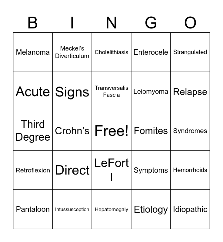 This bingo card has a free space and 31 words: Hepatomegaly, Achalasia, Crohn’s, Anaphylaxis, Melanoma, Cholelithiasis, Signs, Symptoms, Fomites, Etiology, Syndromes, Idiopathic, Complications, Prognosis, Relapse, Disseminated Intravascular Coagulation, Hemorrhoids, Direct, Retroflexion, LeFort I, Strangulated, Endometrial, Pantaloon, Meckel’s Diverticulum, Leiomyoma, Acute, Enterocele, Third Degree, Intussusception, Transversalis Fascia and Gynecomastia.