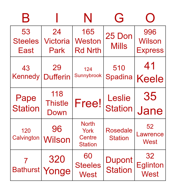 This bingo card has a free space and 24 words: 96 Wilson, 320 Yonge, 124 Sunnybrook, 7 Bathurst, 996 Wilson Express, 53 Steeles East, 43 Kennedy, 24 Victoria Park, Leslie Station, North York Centre Station, 510 Spadina, Pape Station, Rosedale Station, 52 Lawrence West, 29 Dufferin, Dupont Station, 35 Jane, 165 Weston Rd Nrth, 41 Keele, 118 Thistle Down, 32 Eglinton West, 120 Calvington, 25 Don Mills and 60 Steeles West.