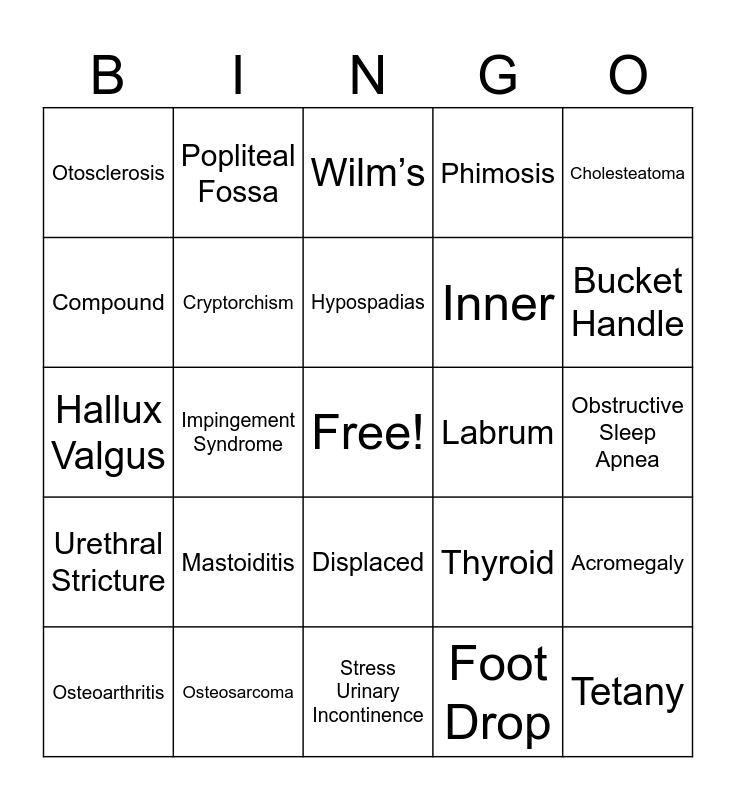 This bingo card has a free space and 30 words: Osteosarcoma, Otitis Media, Impingement Syndrome, Avascular Necrosis, Otosclerosis, Wilm’s, Cryptorchism, Displaced, Labrum, Stress Urinary Incontinence, Obstructive Sleep Apnea, Tetany, Foot Drop, Healthcare-Associated Infection, Bucket Handle, Colles’, Thyroid, Urethral Stricture, Mastoiditis, Cholesteatoma, Hallux Valgus, Subluxation, Popliteal Fossa, Inner, Compound, Phimosis, Acromegaly, Osteoarthritis, Hypospadias and Osteomalacia.