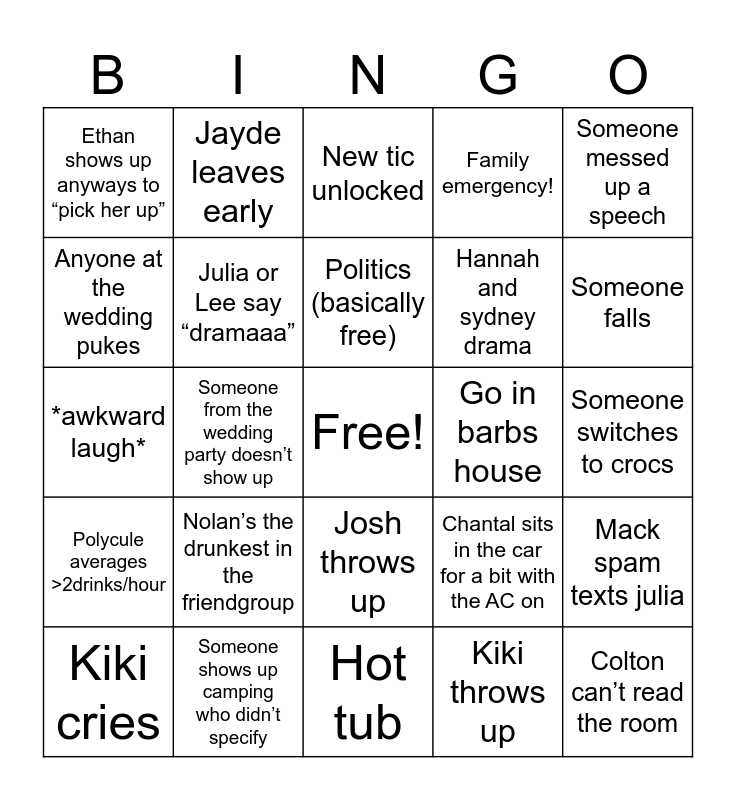 This bingo card has a free space and 24 words: Nolan’s the drunkest in the friendgroup, Someone shows up camping who didn’t specify, Politics (basically free), Kiki cries, Someone messed up a speech, Ethan shows up anyways to “pick her up”, Anyone at the wedding pukes, Jayde leaves early, Go in barbs house, Josh throws up, Hannah and sydney drama, *awkward laugh*, Chantal sits in the car for a bit with the AC on, Mack spam texts julia, Julia or Lee say “dramaaa”, Kiki throws up, Someone switches to crocs, New tic unlocked, Someone falls, Someone from the wedding party doesn’t show up, Colton can’t read the room, Polycule averages >2drinks/hour, Family emergency! and Hot tub.