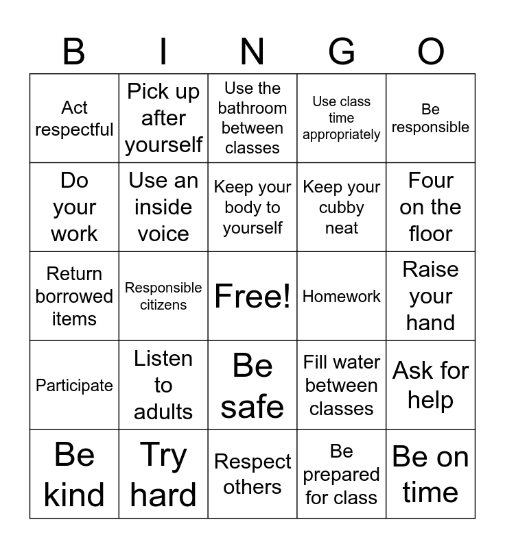 This bingo card has a free space and 24 words: Listen to adults, Try hard, Keep your body to yourself, Be kind, Be responsible, Act respectful, Do your work, Pick up after yourself, Homework, Be safe, Keep your cubby neat, Return borrowed items, Fill water between classes, Ask for help, Use an inside voice, Be prepared for class, Raise your hand, Use the bathroom between classes, Four on the floor, Responsible citizens, Be on time, Participate, Use class time appropriately and Respect others.