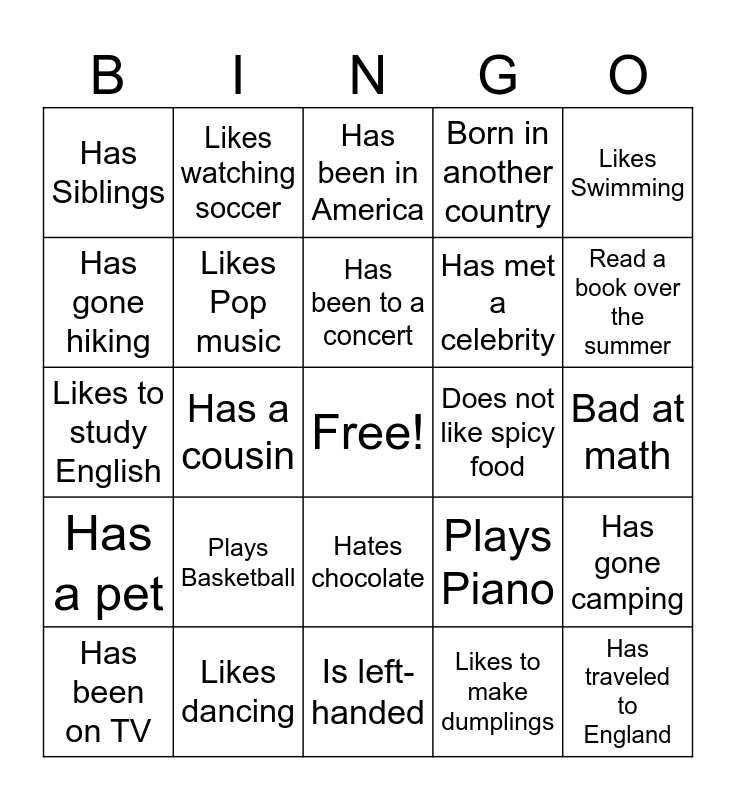 This bingo card has a free space and 24 words: Plays Basketball, Likes dancing, Has been to a concert, Has been on TV, Likes Swimming, Has Siblings, Has gone hiking, Likes watching soccer, Does not like spicy food, Hates chocolate, Has met a celebrity, Likes to study English, Plays Piano, Has gone camping, Likes Pop music, Likes to make dumplings, Bad at math, Has been in America, Read a book over the summer, Has a cousin, Has traveled to England, Has a pet, Born in another country and Is left-handed.