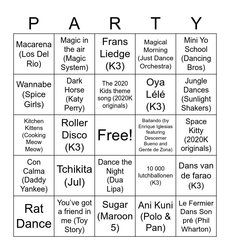 This bingo card has a free space and 27 words: 10 000 lutchballonen (K3), Voyage en Europe (Roland Cristal), Oya Lélé (K3), Sugar (Maroon 5), Wannabe (Spice Girls), Frans Liedge (K3), Magic in the air (Magic System), Con Calma (Daddy Yankee), Bailando (by Enrique Iglesias featuring Descemer Bueno and Gente de Zona), Dans van de farao (K3), Kitchen Kittens (Cooking Meow Meow), Magical Morning (Just Dance Orchestra), Rat Dance, You’ve got a friend in me (Toy Story), Jungle Dances (Sunlight Shakers), Soy Yo (Bomba Éstroy), Dark Horse (Katy Perry), The 2020 Kids theme song (2020K originals), Tchikita (Jul), Macarena (Los Del Rio), Space Kitty (2020K originals), Ani Kuni (Polo & Pan), Roller Disco (K3), Le Fermier Dans Son pré (Phil Wharton), Dance the Night (Dua Lipa), Mini Yo School (Dancing Bros) and Le bal masqué (Compagnie Créole).