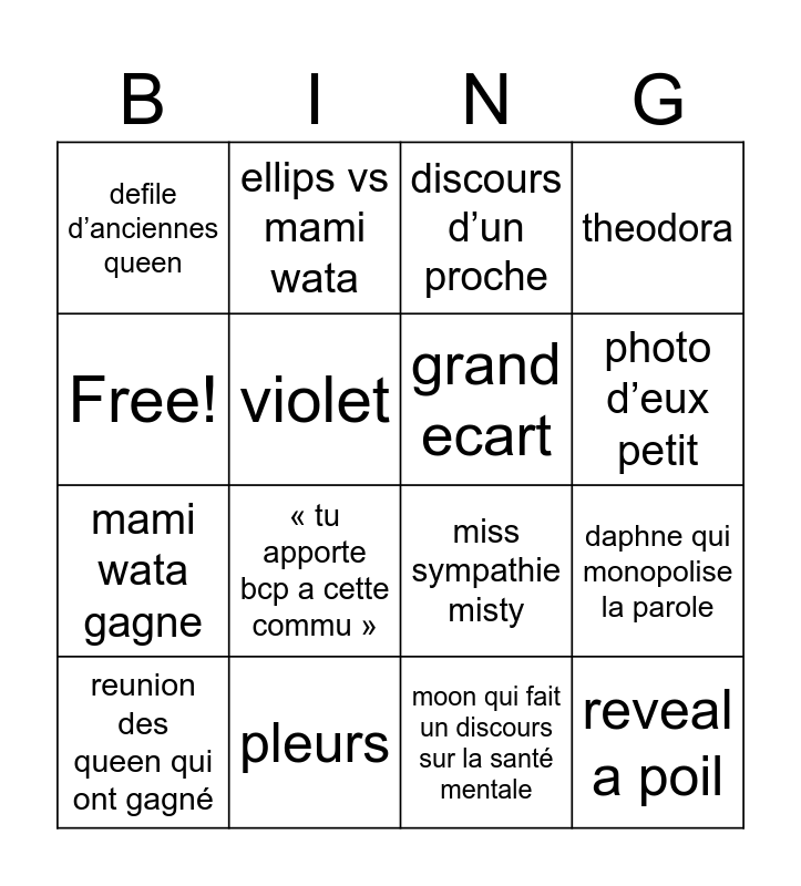This bingo card has 16 words: pleurs, daphne qui monopolise la parole, discours d’un proche, defile d’anciennes queen, mami wata gagne, ellips vs mami wata, miss sympathie misty, moon qui fait un discours sur la santé mentale, Free!, violet, reunion des queen qui ont gagné, theodora, « tu apporte bcp a cette commu », photo d’eux petit, grand ecart and reveal a poil.