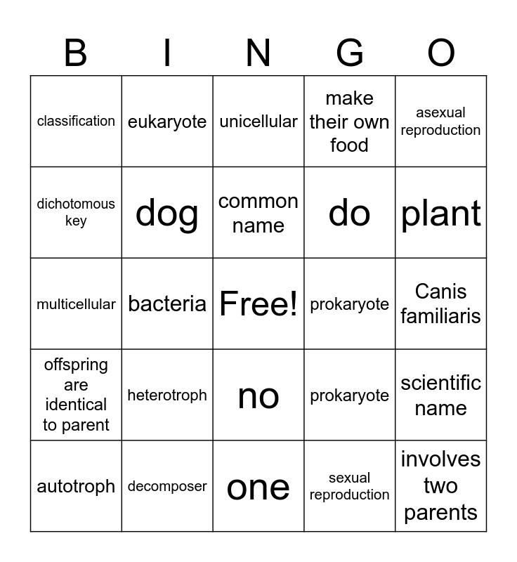 This bingo card has a free space and 24 words: heterotroph, decomposer, common name, autotroph, asexual reproduction, classification, dichotomous key, eukaryote, prokaryote, no, do, multicellular, prokaryote, scientific name, dog, sexual reproduction, Canis familiaris, unicellular, plant, bacteria, involves two parents, offspring are identical to parent, make their own food and one.