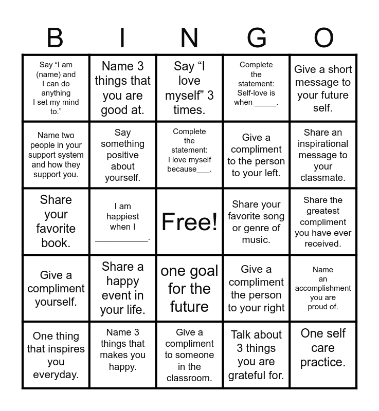 This bingo card has a free space and 24 words: Share a happy event in your life., Name 3 things that makes you happy., Complete the statement: I love myself because___., One thing that inspires you everyday., Give a short message to your future self., Say “I am (name) and I can do anything I set my mind to.”, Name two people in your support system and how they support you., Name 3 things that you are good at., Share your favorite song or genre of music., one goal for the future, Give a compliment to the person to your left., Share your favorite book., Give a compliment the person to your right, Name an accomplishment you are proud of., Say something positive about yourself., Talk about 3 things you are grateful for., Share the greatest compliment you have ever received., Say “I love myself” 3 times., Share an inspirational message to your classmate., I am happiest when I ___________., One self care practice., Give a compliment yourself., Complete the statement: Self-love is when _____. and Give a compliment to someone in the classroom..