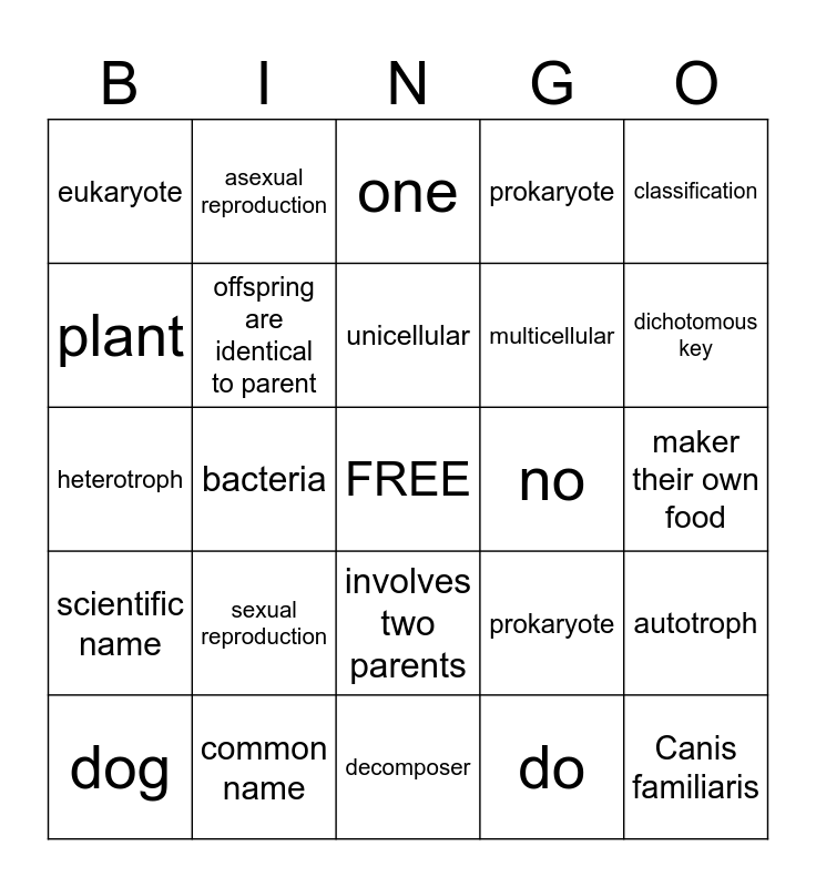 This bingo card has a free space and 24 words: sexual reproduction, common name, unicellular, dog, classification, eukaryote, plant, asexual reproduction, no, involves two parents, multicellular, heterotroph, prokaryote, autotroph, offspring are identical to parent, do, maker their own food, one, dichotomous key, bacteria, Canis familiaris, scientific name, prokaryote and decomposer.