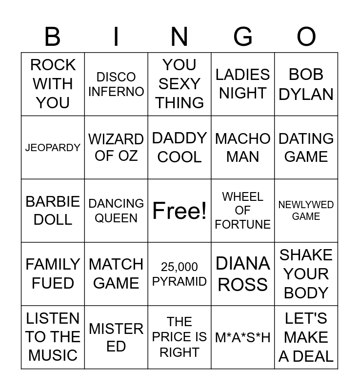 This bingo card has a free space and 29 words: LISTEN TO THE MUSIC, MINI SKIRT, DANCING QUEEN, HEART OF GLASS, ROCK WITH YOU, YOU SEXY THING, WIZARD OF OZ, MATCH GAME, WHEEL OF FORTUNE, MISTER ED, NEWLYWED GAME, LET'S MAKE A DEAL, THE PRICE IS RIGHT, M*A*S*H, DATING GAME, NIGHT FEVER, 25,000 PYRAMID, FAMILY FUED, BOB DYLAN, BARBIE DOLL, DIANA ROSS, HOLLYWOOD SQUARES, MACHO MAN, JEOPARDY, LADIES NIGHT, DISCO INFERNO, SHAKE YOUR BODY, DADDY COOL and BEST OF MY LOVE.