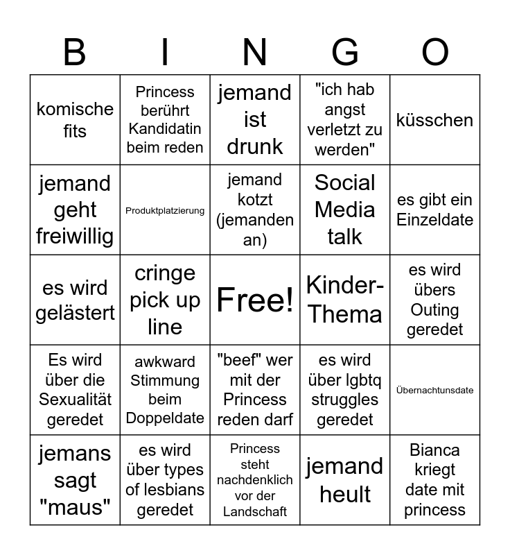 This bingo card has a free space and 29 words: jemans sagt "maus", es wird rumgemacht, cringe pick up line, flirt unter den Kandidatinnen, komische fits, jemand ist drunk, Produktplatzierung, awkward Stimmung beim Doppeldate, Kinder-Thema, es wird über types of lesbians geredet, es wird übers Outing geredet, Bianca kriegt date mit princess, Princess steht nachdenklich vor der Landschaft, jemand heult, es gibt ein Einzeldate, tragic backstory, "beef" wer mit der Princess reden darf, Es wird über die Sexualität geredet, küsschen, es wird gelästert, es wird über lgbtq struggles geredet, Jemand sagt "maus", Social Media talk, jemand geht freiwillig, "ich hab angst verletzt zu werden", Princess berührt Kandidatin beim reden, Übernachtunsdate, jemand kotzt (jemanden an) and Tochter von Princess ist da.