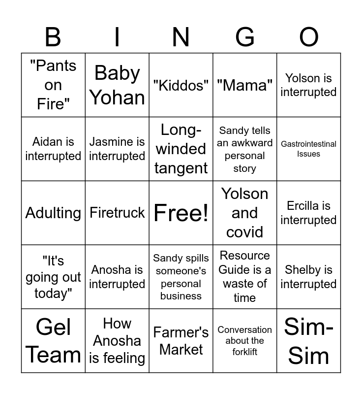 This bingo card has a free space and 24 words: Anosha is interrupted, How Anosha is feeling, Long-winded tangent, Gel Team, Yolson is interrupted, "Pants on Fire", Aidan is interrupted, Baby Yohan, Yolson and covid, Sandy spills someone's personal business, Sandy tells an awkward personal story, Adulting, Resource Guide is a waste of time, Shelby is interrupted, Jasmine is interrupted, Conversation about the forklift, Ercilla is interrupted, "Kiddos", Gastrointestinal Issues, Firetruck, Sim-Sim, "It's going out today", "Mama" and Farmer's Market.