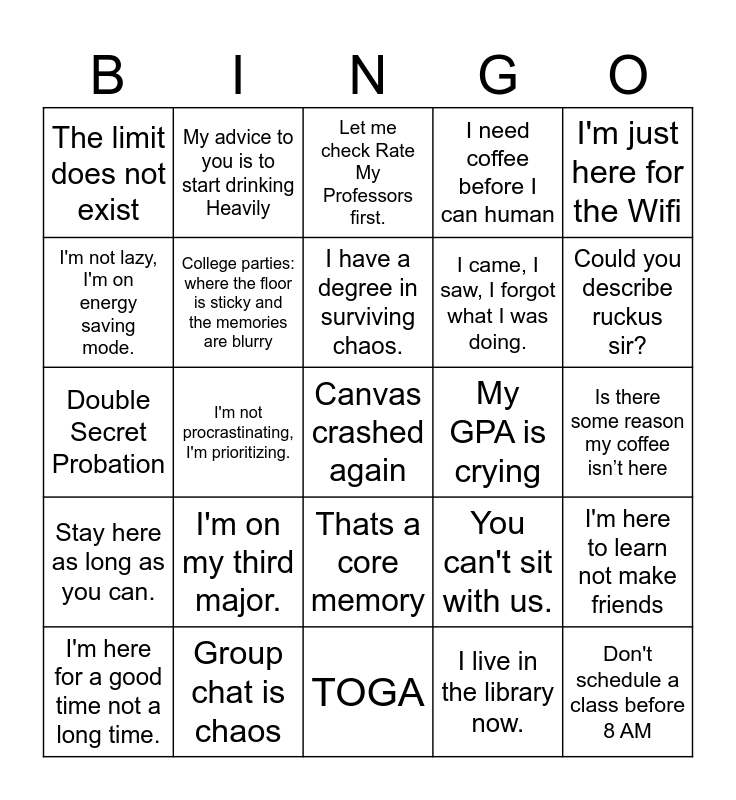 This bingo card has a free space and 44 words: C's get degrees, Don't schedule a class before 8 AM, College: where the days are long and the years are short, I'm here for a good time not a long time., Is this going to be on the test., I live in the library now., Let me check Rate My Professors first., Zoom Fatigue is real, I'm just here for the Wifi, Group chat is chaos, I need coffee before I can human, My GPA is crying, Thats a core memory, I'm on my third major., Can we get credit for showing up?, TOGA, Food Fight, Double Secret Probation, Fat, Drunk and Stupid is no way to go through life., Could you describe ruckus sir?, My advice to you is to start drinking Heavily, Sometimes I have a feeling I can do crystal meth, but then I think, mmm... better not, It has come to my attention that the maintenance staff is switching our toilet paper from Charmin... to generic. All those opposed to chafing, please say aye, The limit does not exist, I’m hungry... all the time, Is there some reason my coffee isn’t here, Help me, I’m poor, May the odds be ever in your favor., You can't sit with us., Stay here as long as you can., There 's so much room for activities., I'm here to learn not make friends, Your killing me smalls, Where ramen is gourmet and sleep is optional., I'm not procrastinating, I'm prioritizing., The Syllabus is a suggestion, right?, Group Project? More like solo mission., I’m not late, I’m just fashionably enrolled, I have a degree in surviving chaos., I'm not lazy, I'm on energy saving mode., I came, I saw, I forgot what I was doing., I'm just here for the free pizza. q, College parties: where the floor is sticky and the memories are blurry and Weekend plans: 1% studying, 99% pretending I’m not stressed.