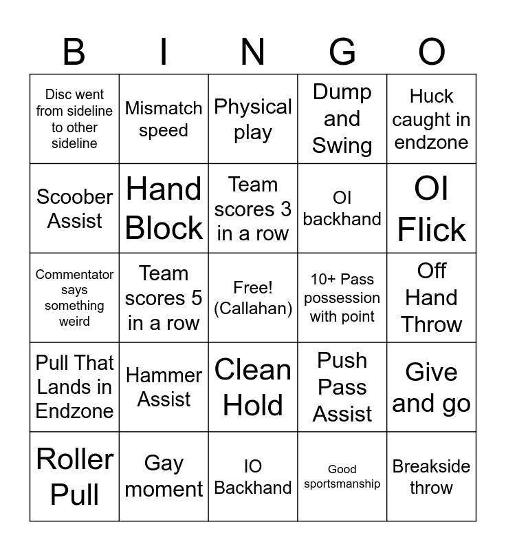 This bingo card has a free space and 39 words: Layout D, Layout catch, Second Chance Catch, Hand Block, Roller Pull, Clean Hold, Team scores 3 in a row, Break Point, Huck caught in endzone, Pull That Lands in Endzone, Team scores 5 in a row, Dump and Swing, Breakside throw, Off Hand Throw, 10+ Pass possession with point, Hammer Assist, Stalled Opponent Down, Disc went from sideline to other sideline, Sky Opponent, Push Pass Assist, Scoober Assist, IO Backhand, OI backhand, OI Flick, IO flick, Threw out of bounds, Weird celebration, Spiking disc, Someone getting skyed, Mismatch speed, Catching D, Endzone play, Physical play, Gay moment, Good sportsmanship, Bookends, Give and go, Commentator says something weird and Failed layout.
