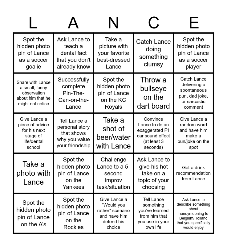 This bingo card has a free space and 24 words: Spot the hidden photo pin of Lance on the Yankees, Spot the hidden photo pin of Lance on the Rockies, Spot the hidden photo pin of Lance on the KC Royals, Spot the hidden photo pin of Lance on the A’s, Spot the hidden photo pin of Lance as a soccer player, Spot the hidden photo pin of Lance as a soccer goalie, Share with Lance a small, funny observation about him that he might not notice, Ask Lance to teach a dental fact that you don't already know, Convince Lance to do an exaggerated F1 car sound effect (at least 3 seconds), Challenge Lance to a 5-second improv task/situation, Throw a bullseye on the dart board, Give Lance a piece of advice for his next stage of life/dental school, Ask Lance to give his hot take on a topic of your choosing, Get a drink recommendation from Lance, Successfully complete Pin-The-Can-on-the-Lance, Tell Lance something you’ve learned from him that you use in your own life, Give Lance a random word and have him make a pun/joke on the spot, Take a picture with your favorite best-dressed Lance, Catch Lance delivering a spontaneous pun, dad joke, or sarcastic comment, Tell Lance a personal story that shows why you value your friendship, Ask Lance to describe something about honeymooning to Belgium/Holland that you specifically would enjoy, Take a photo with Lance, Catch Lance doing something clumsy and Give Lance a "Would you rather" scenario and have him defend his choice.
