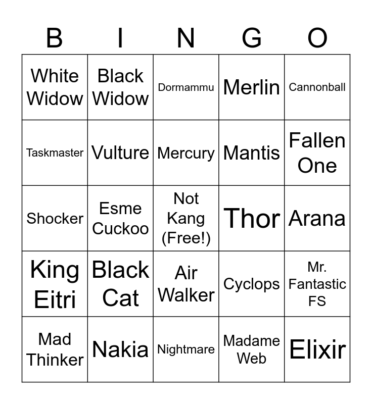 This bingo card has a free space and 24 words: Black Cat, Nakia, Mercury, Mad Thinker, Cannonball, White Widow, Taskmaster, Black Widow, Thor, Air Walker, Mantis, Shocker, Cyclops, Mr. Fantastic FS, Vulture, Madame Web, Arana, Dormammu, Fallen One, Esme Cuckoo, Elixir, King Eitri, Merlin and Nightmare.