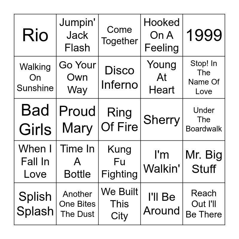 This bingo card has 90 words: Let's Stay Together, I Second That Emotion, Kung Fu Fighting, Heart of Glass, Give Me The Night, Wild Thing, Ramblin' Man, Margaritaville, Sh-Boom, California Girls, Return To Sender, Old Time Rock & Roll, Love Will Keep Us Together, Under The Boardwalk, This Old Heart Of Mine (Is Weak For You), Disco Inferno, Rock With You, Burning Love, Reeling In The Years, I'm Coming Out, What's Going On, Cats In The Cradle, We Built This City, I Want You Back, Bad Girls, Another One Bites The Dust, Hound Dog, Centerfold, Take It Easy, Bye Bye Love, Maybellene, Mr. Big Stuff, Charlie Brown, When I Fall In Love, Rio, Hooked On A Feeling, Come Together, I Wish, Proud Mary, Stop! In The Name Of Love, Splish Splash, Walking On Sunshine, Tell Him, King Of The Road, My Sharona, I'm Walkin', Rock And Roll Is Here To Stay, Diana, It's All In The Game, A Hard Day's Night, You Send Me, Young At Heart, Only You, Ain't Too Proud To Beg, Papa's Got A Brand New Bag, Duke Of Earl, Sherry, Heat Wave, It's Not Unusual, Fever, Devil With A Blue Dress On, Baby, Now That I Found You, One For My Baby (And One More For The Road), Kokomo, This Magic Moment, Crocodile Rock, It's Only Make Believe, I'll Be Around, Runaway, Do You Love Me, Time In A Bottle, Ring Of Fire, You Are The Sunshine Of My Life, Please Please Me, Jumpin' Jack Flash, Go Your Own Way, Stuck In The Middle With You, Vehicle, Like A Prayer, A Teenager In Love, Reach Out I'll Be There, 1999, Travelin' Man, Dream A Little Dream Of Me, Come On, Let's Go, Let Your Love Flow, American Girl, Good Lovin', Tell Her About It and Break On Through (To The Other Side).