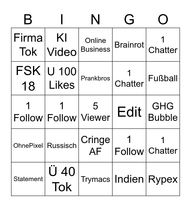 This bingo card has a free space and 24 words: Russisch, Ü 40 Tok, Prankbros, Statement, 1 Chatter, Firma Tok, FSK 18, KI Video, Edit, Cringe AF, 1 Chatter, 1 Follow, 1 Follow, 1 Chatter, U 100 Likes, Indien, GHG Bubble, Online Business, Fußball, 1 Follow, Rypex, OhnePixel, Brainrot and Trymacs.