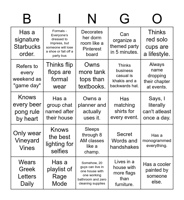 This bingo card has 40 words: Lives in a hoodie and backwards cap, Knows every beer pong rule by heart, Calls everyone bro. even professors, Thinks flip flops are formal wear, Has a playlist of Rage Mode, Sleeps through 8 AM classes like a champ., Owns more tank tops than textbooks., Yells, Lets go at Everything., Thinks red solo cups are a lifestyle., Only wear Vineyard Vines, Has a group chat named after their house, Can organize a themed party in 5 minutes., Owns a planner and actually uses it., Says, I literally can't atleast once a day., Has matching shirts for every event., Knows the best lighting for selfies, Can walk in heels across campus., Has a signature Starbucks order., Says Squad Goals, Decorates her dorm room like a Pinterest board, Has a monogrammed everything., Lives in a house with more flags than furniture., Thinks business casual is khakis and a backwards hat., Refers to every weekend as "game day", Can shotgun a beer faster than he can answer a test question, Has a group chat called The Bros, Calls everyone Legend, Thinks networking means meeting people at parties., Has a cooler painted by someone else., Knows her big and little better than her major., Lives in a house that smells like Axe body spray and pizza., Wears Greek Letters Daily, No one really knows what goes on during initiation, Secret Words and handshakes, Always name dropping their chapter at events., Somehow, 20 guys can live in one house with one working bathroom and zero cleaning supplies, Chapter meetings are basically mini parliaments with snacks, Recruitment? Chant. Winning a game? Chant. Breathing? Probably a chant, Formals - Everyone’s dressed to impress, but someone will lose a shoe or fall off a party bus and Greek Letters.