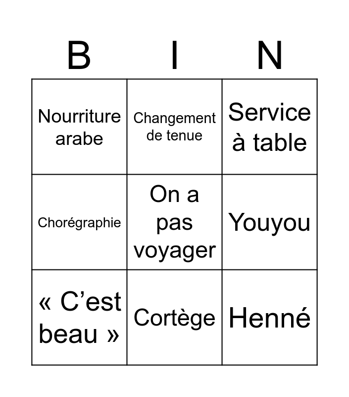 This bingo card has a free space and 8 words: Youyou, Service à table, Changement de tenue, « C’est beau », Nourriture arabe, Henné, Chorégraphie and Cortège.