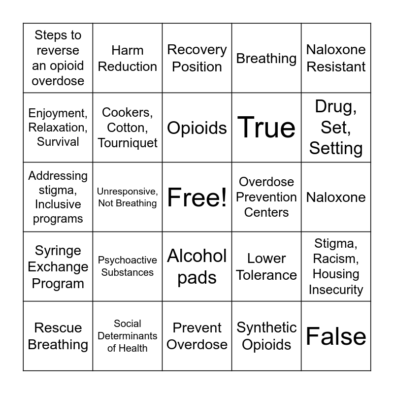 This bingo card has a free space and 24 words: Psychoactive Substances, Social Determinants of Health, Opioids, Rescue Breathing, Naloxone Resistant, Steps to reverse an opioid overdose, Enjoyment, Relaxation, Survival, Harm Reduction, Overdose Prevention Centers, Alcohol pads, True, Addressing stigma, Inclusive programs, Lower Tolerance, Stigma, Racism, Housing Insecurity, Cookers, Cotton, Tourniquet, Synthetic Opioids, Naloxone, Recovery Position, Drug, Set, Setting, Unresponsive, Not Breathing, False, Syringe Exchange Program, Breathing and Prevent Overdose.
