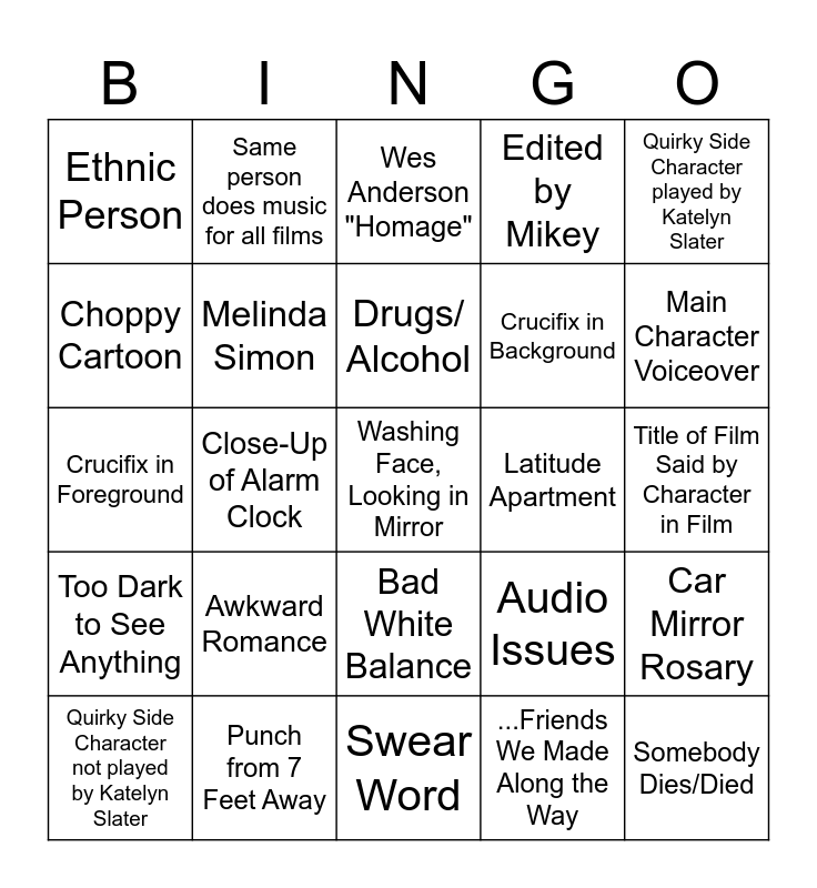 This bingo card has 25 words: Awkward Romance, Swear Word, Drugs/ Alcohol, Quirky Side Character not played by Katelyn Slater, Quirky Side Character played by Katelyn Slater, Ethnic Person, Choppy Cartoon, Same person does music for all films, Latitude Apartment, Bad White Balance, Crucifix in Background, Crucifix in Foreground, Audio Issues, Car Mirror Rosary, Melinda Simon, Somebody Dies/Died, Title of Film Said by Character in Film, Wes Anderson "Homage", Main Character Voiceover, Close-Up of Alarm Clock, Washing Face, Looking in Mirror, Punch from 7 Feet Away, Too Dark to See Anything, Edited by Mikey and ...Friends We Made Along the Way.