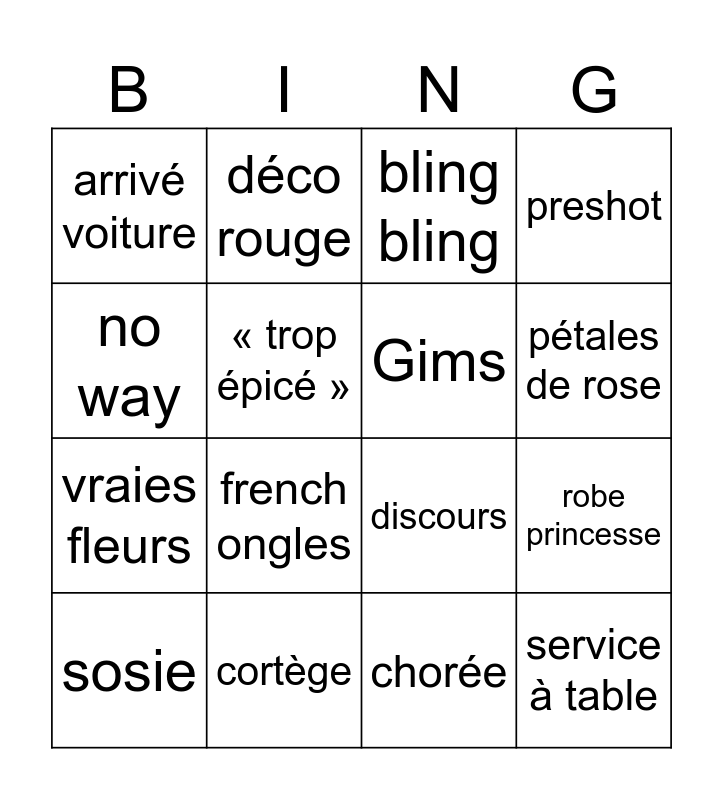 This bingo card has 16 words: cortège, robe princesse, bling bling, arrivé voiture, vraies fleurs, déco rouge, discours, chorée, no way, « trop épicé », sosie, preshot, french ongles, pétales de rose, Gims and service à table.