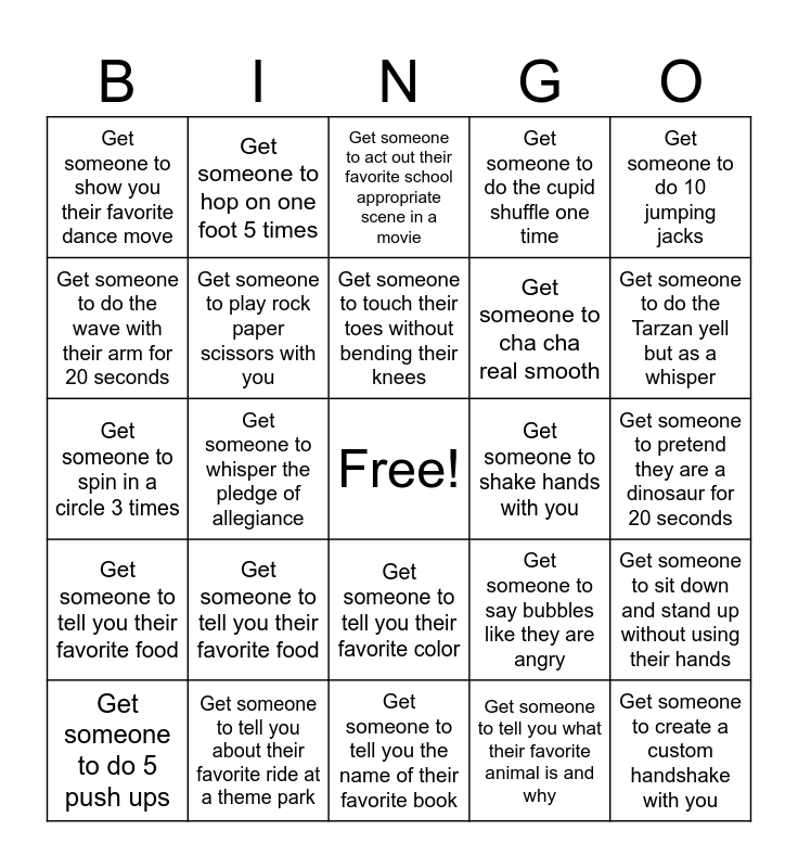 This bingo card has a free space and 29 words: Get someone to do 5 push ups, Get someone to stand on one foot for 20 seconds, Get someone to whisper the pledge of allegiance, Get two people to play ring around the rosy, Get someone to show you their favorite dance move, Get someone to act out their favorite school appropriate scene in a movie, Get someone to play rock paper scissors with you, Get someone to tell you their favorite food, Get someone to shake hands with you, Get someone to tell you about their favorite ride at a theme park, Get someone to pretend they are a dinosaur for 20 seconds, Get someone to create a custom handshake with you, Get someone to tell you the name of their favorite book, Get someone to tell you what their favorite animal is and why, Get someone to do the Tarzan yell but as a whisper, Get someone to sing the chorus of their favorite song, Get someone to tell you their favorite color, Get someone to tell you their favorite food, Get someone to do 10 jumping jacks, Get someone to spin in a circle 3 times, Get someone to say bubbles like they are angry, Get someone to skip ten steps forward, Get someone to cha cha real smooth, Get someone to do the wave with their arm for 20 seconds, Get someone to do the cupid shuffle one time, Get someone to hop on one foot 5 times, Get someone to sit down and stand up without using their hands, Get someone to touch their toes without bending their knees and Get someone to do 4 lunges.