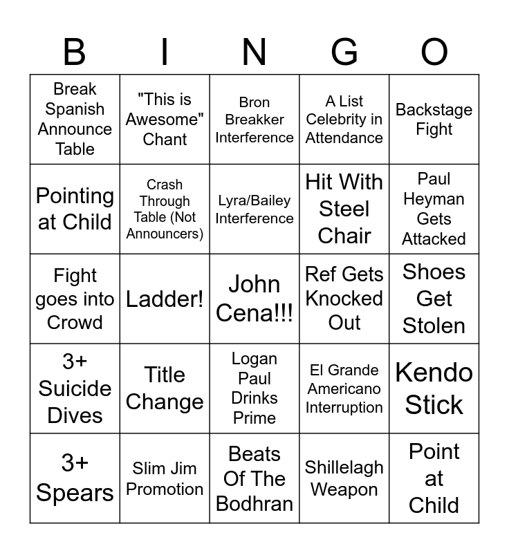 This bingo card has a free space and 24 words: Title Change, Slim Jim Promotion, Lyra/Bailey Interference, 3+ Spears, Backstage Fight, Break Spanish Announce Table, Pointing at Child, "This is Awesome" Chant, Ref Gets Knocked Out, Logan Paul Drinks Prime, Hit With Steel Chair, Fight goes into Crowd, El Grande Americano Interruption, Kendo Stick, Crash Through Table (Not Announcers), Shillelagh Weapon, Shoes Get Stolen, Bron Breakker Interference, Paul Heyman Gets Attacked, Ladder!, Point at Child, 3+ Suicide Dives, A List Celebrity in Attendance and Beats Of The Bodhran.