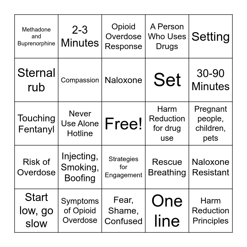This bingo card has a free space and 24 words: Injecting, Smoking, Boofing, Symptoms of Opioid Overdose, Naloxone, Start low, go slow, Setting, Methadone and Buprenorphine, Sternal rub, 2-3 Minutes, Harm Reduction for drug use, Strategies for Engagement, Set, Touching Fentanyl, Rescue Breathing, Naloxone Resistant, Compassion, One line, Pregnant people, children, pets, Opioid Overdose Response, 30-90 Minutes, Never Use Alone Hotline, Harm Reduction Principles, Risk of Overdose, A Person Who Uses Drugs and Fear, Shame, Confused.