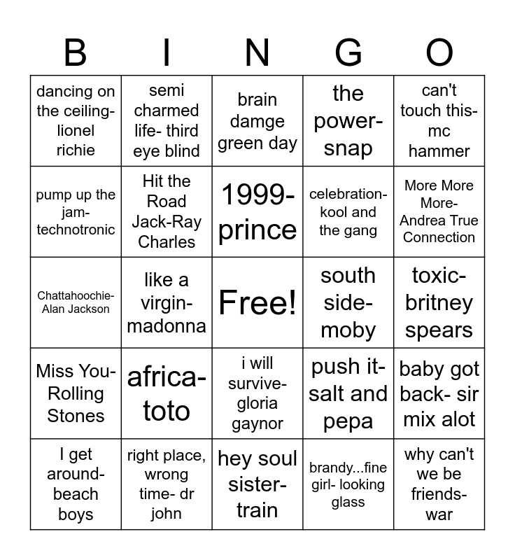 This bingo card has a free space and 50 words: wake me up...- wham, why can't we be friends- war, brown eyed girl- van morrison, hey soul sister- train, africa- toto, 867-5309 Jenny- tommy tutone, semi charmed life- third eye blind, Twist and Shout-The Beatles, pump up the jam- technotronic, what i got- sublime, Hit the Road Jack-Ray Charles, the power- snap, baby got back- sir mix alot, push it- salt and pepa, jessie's girl- rick springfield, it's the end of the world- rem, 1999- prince, south side- moby, rock with you- michael jackson, can't touch this- mc hammer, like a virgin- madonna, brandy...fine girl- looking glass, dancing on the ceiling- lionel richie, celebration- kool and the gang, abc- jackson 5, flashdance..what a feeling- irene cara, More More More-Andrea True Connection, flagpole sitta- harvey danger, brain damge green day, i will survive- gloria gaynor, relax- frankie goes to hollywood, jukebox hero- foreigner, don't bring me down- elo, don't start now- dua lipa, right place, wrong time- dr john, groove is in the heart- dee lite, rock the casbah- clash, got to be real- cheryl lynn, gonna make you sweat- c&c music factory, toxic- britney spears, more than a feeling- boston, Rock Around the Clock-Bill Haley & the Comets, call me- blondie, poison- bell biv devoe, I get around- beach boys, Chattahoochie-Alan Jackson, Need You Tonight-INXS, Get Down Tonight-KC & the Sunshine Band, Miss You-Rolling Stones and Don't Stop-Fleetwood Mac.