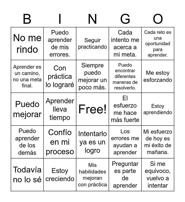 This bingo card has a free space and 29 words: Todavía no lo sé, Todo esfuerzo cuenta, Aprender lleva tiempo, Puedo buscar otra estrategia, No me rindo, Seguir practicando, Con práctica lo lograré, Confío en mi proceso, El esfuerzo me hace más fuerte, Estoy creciendo, Estoy aprendiendo, Si me equivoco, vuelvo a intentar, Mis habilidades mejoran con práctica, Preguntar es parte de aprender, Me estoy esforzando, Cada día avanzo un poco más, Intentarlo ya es un logro, Puedo aprender de los demás, Cada reto es una oportunidad para aprender., Puedo mejorar, Los errores me ayudan a aprender, Si hoy no me salió, mañana lo intentaré mejor., Puedo encontrar diferentes maneras de resolverlo., Aprender es un camino, no una meta final., Cada intento me acerca a mi meta., Puedo aprender de mis errores., Mi esfuerzo de hoy es mi éxito de mañana., Siempre puedo mejorar un poco más. and Los errores son oportunidades.