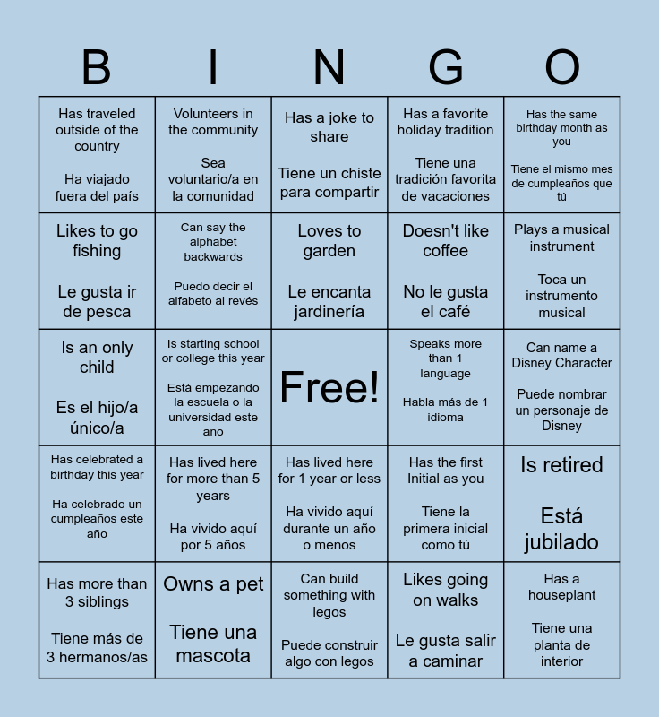 This bingo card has a free space and 24 words: Has lived here for more than 5 years Ha vivido aquí por 5 años, Owns a pet Tiene una mascota, Loves to garden Le encanta jardinería, Has more than 3 siblings Tiene más de 3 hermanos/as, Has the same birthday month as you Tiene el mismo mes de cumpleaños que tú, Has traveled outside of the country Ha viajado fuera del país, Likes to go fishing Le gusta ir de pesca, Volunteers in the community Sea voluntario/a en la comunidad, Speaks more than 1 language Habla más de 1 idioma, Has lived here for 1 year or less Ha vivido aquí durante un año o menos, Doesn't like coffee No le gusta el café, Is an only child Es el hijo/a único/a, Has the first Initial as you Tiene la primera inicial como tú, Is retired Está jubilado, Can say the alphabet backwards Puedo decir el alfabeto al revés, Likes going on walks Le gusta salir a caminar, Can name a Disney Character Puede nombrar un personaje de Disney, Has a joke to share Tiene un chiste para compartir, Plays a musical instrument Toca un instrumento musical, Is starting school or college this year Está empezando la escuela o la universidad este año, Has a houseplant Tiene una planta de interior, Has celebrated a birthday this year Ha celebrado un cumpleaños este año, Has a favorite holiday tradition Tiene una tradición favorita de vacaciones and Can build something with legos Puede construir algo con legos.