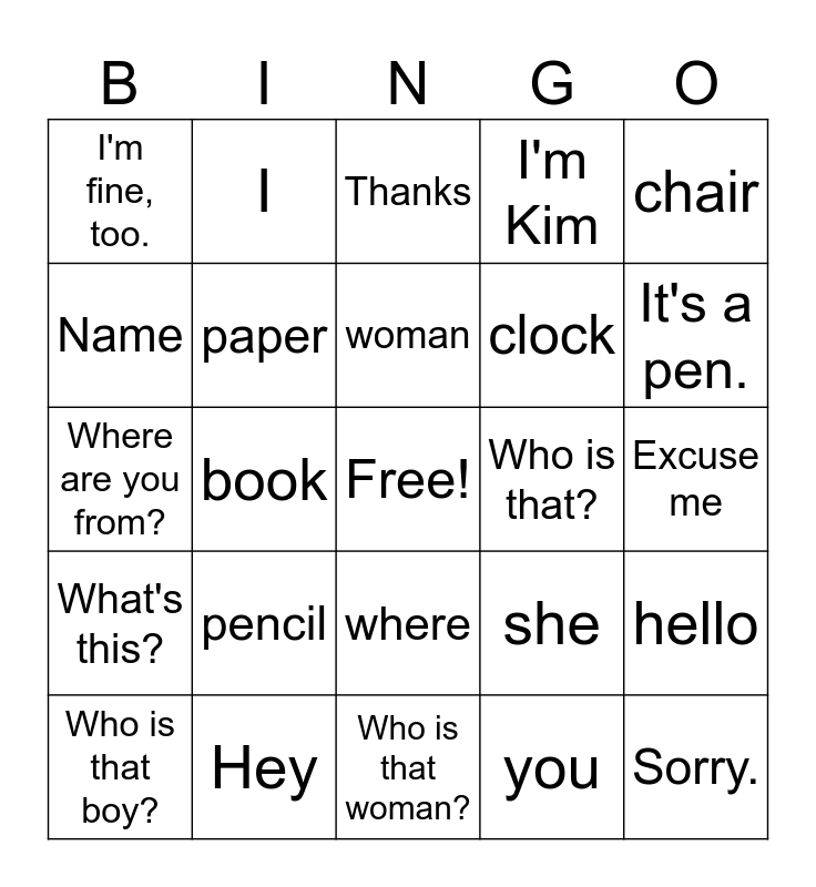 This bingo card has a free space and 38 words: boy, table, girl, paper, hello, pencil, woman, man, chair, clock, book, I'm Kim, Sorry., Excuse me, Name, What's this?, Fine, Thanks, ball, Who is that?, I'm fine, too., Hey, It's a pen., Who is that boy?, Who is that girl?, Who is that woman?, Who is that man?, It is a table., It is a book., It is a clock., map, where, you, I, he, she, Where are you from? and Could you repeat that?.