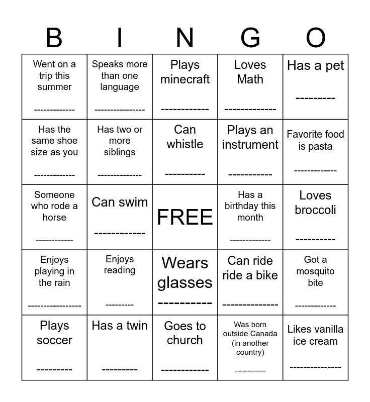 This bingo card has a free space and 24 words: Enjoys reading ---------, Has a twin ---------, Can whistle ----------, Plays soccer ---------, Has a pet ---------, Went on a trip this summer -------------, Has the same shoe size as you -------------, Speaks more than one language ----------------, Has a birthday this month -------------, Wears glasses ----------, Plays an instrument -----------, Someone who rode a horse ------------, Can ride ride a bike --------------, Got a mosquito bite -------------, Has two or more siblings --------------, Was born outside Canada (in another country) ------------, Loves broccoli ----------, Plays minecraft ------------, Favorite food is pasta -------------, Can swim ------------, Likes vanilla ice cream ---------------, Enjoys playing in the rain -----------------, Loves Math ------------- and Goes to church ------------.
