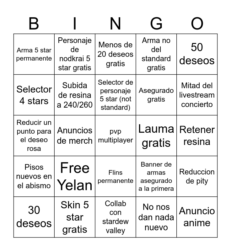 This bingo card has a free space and 24 words: Free Yelan, Skin 5 star gratis, Selector de personaje 5 star (not standard), 30 deseos, 50 deseos, Arma 5 star permanente, Selector 4 stars, Personaje de nodkrai 5 star gratis, Lauma gratis, Flins permanente, Asegurado gratis, Reducir un punto para el deseo rosa, Banner de armas asegurado a la primera, Reduccion de pity, Subida de resina a 240/260, No nos dan nada nuevo, Retener resina, Menos de 20 deseos gratis, Mitad del livestream concierto, Anuncios de merch, Anuncio anime, Pisos nuevos en el abismo, Arma no del standard gratis and Collab con stardew valley.