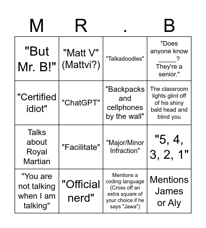 This bingo card has 20 words: "5, 4, 3, 2, 1", "Wake up, shut up, listen up", "Talkadoodles", "Close your lappytoppys", "You are not talking when I am talking", "Certified idiot", "Official nerd", "But Mr. B!", Talks about Royal Martian, "Matt V" (Mattvi?), "Facilitate", "Major/Minor Infraction", "ChatGPT", Mentions James or Aly, "Backpacks and cellphones by the wall", Smiles like he just said something really smart/funny that was not smart/funny in the slightest, The classroom lights glint off of his shiny bald head and blind you, "Does anyone know _____? They're a senior.", Mentions a coding language (Cross off an extra square of your choice if he says "Jawa") and "See what I did there?".
