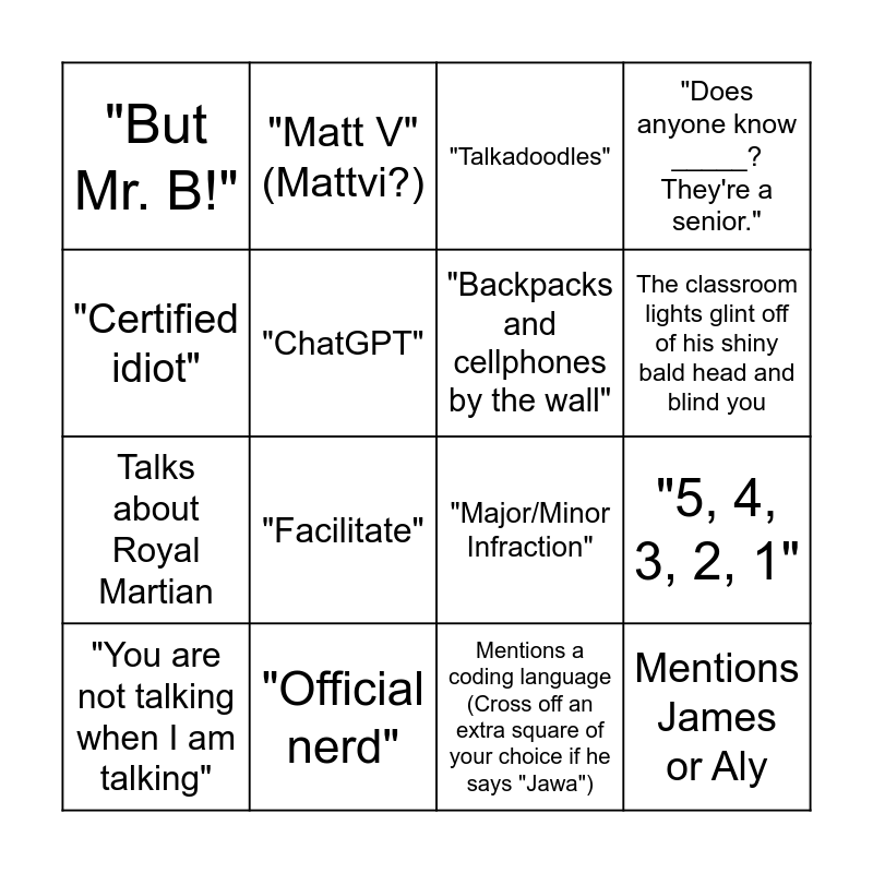 This bingo card has 20 words: "5, 4, 3, 2, 1", "Wake up, shut up, listen up", "Talkadoodles", "Close your lappytoppys", "You are not talking when I am talking", "Certified idiot", "Official nerd", "But Mr. B!", Talks about Royal Martian, "Matt V" (Mattvi?), "Facilitate", "Major/Minor Infraction", "ChatGPT", Mentions James or Aly, "Backpacks and cellphones by the wall", Smiles like he just said something really smart/funny that was not smart/funny in the slightest, The classroom lights glint off of his shiny bald head and blind you, "Does anyone know _____? They're a senior.", Mentions a coding language (Cross off an extra square of your choice if he says "Jawa") and "See what I did there?".