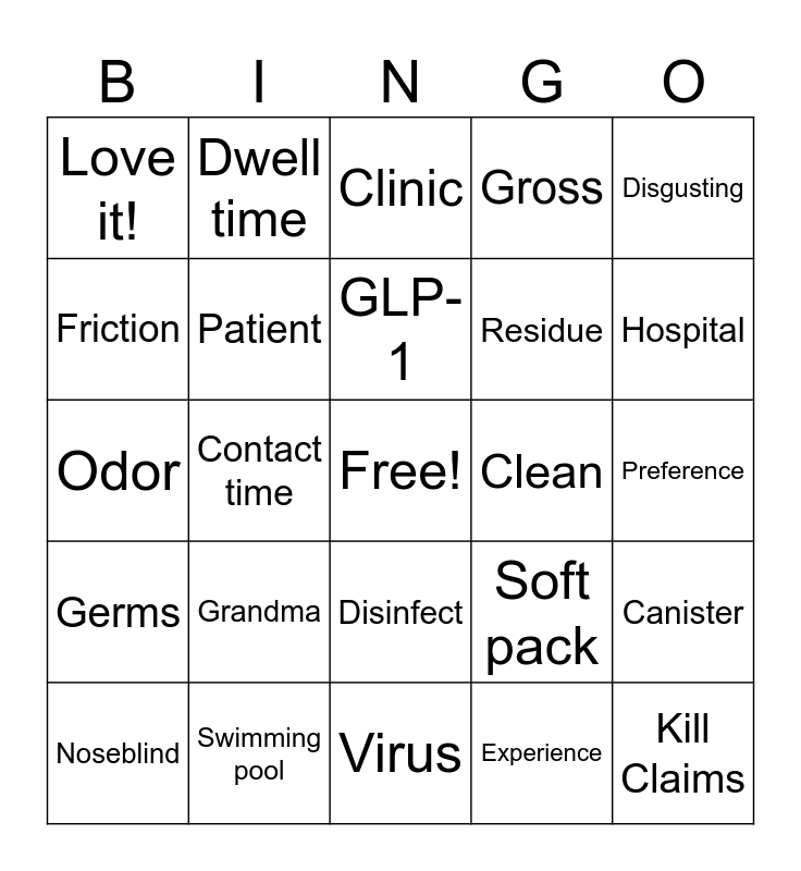 This bingo card has a free space and 24 words: Grandma, Swimming pool, GLP-1, Noseblind, Disgusting, Love it!, Friction, Dwell time, Clean, Disinfect, Residue, Odor, Soft pack, Canister, Patient, Experience, Preference, Clinic, Hospital, Contact time, Kill Claims, Germs, Gross and Virus.