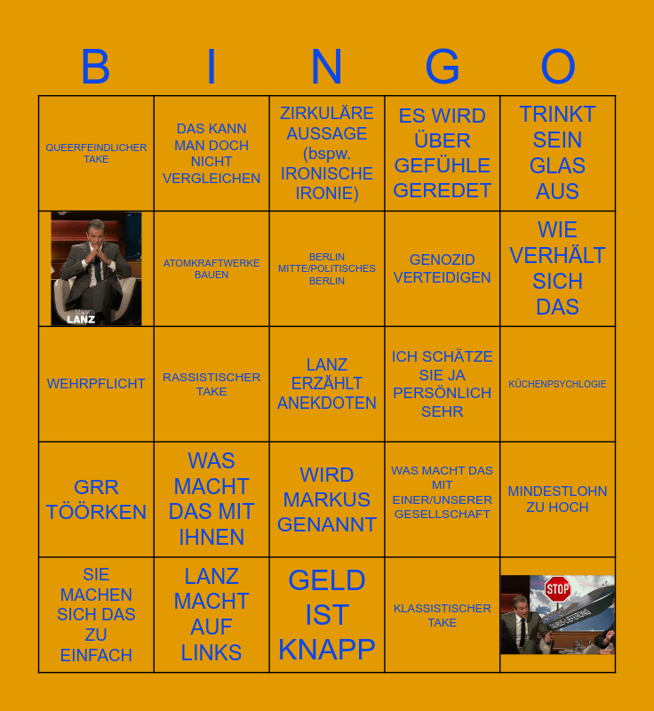 This bingo card has 5 images, a free space and 41 words: DIESER TAGE, DIE WOLLEN DOCH GARNICHT ARBEITEN!!, GELD IST KNAPP, WAS MACHT DAS MIT IHNEN, HABEN WIR DA NICHT EIN THEMA ?, DAS KANN MAN DOCH NICHT VERGLEICHEN, ICH SEHE DAS DIFFERENZIERTER, DAS ÜBERFORDERT DOCH DIE LEUTE, ATOMKRAFTWERKE BAUEN, ES WIRD ÜBER GEFÜHLE GEREDET, MINDESTLOHN ZU HOCH, WAS MACHT DAS MIT EINER/UNSERER GESELLSCHAFT, DIE UMFRAGEN, STREAM STÜRTZT AB, BERLIN MITTE/POLITISCHES BERLIN, ICH SCHÄTZE SIE JA PERSÖNLICH SEHR, WENN ICH SIE RICHTIG VERSTANDNEN HABE, TRINKT SEIN GLAS AUS, RASSISTISCHER TAKE, KLASSISTISCHER TAKE, QUEERFEINDLICHER TAKE, GENOZID VERTEIDIGEN, LANZ DUZT, WIE VERHÄLT SICH DAS, SIE MACHEN SICH DAS ZU EINFACH, HUFEISEN, WIRD MARKUS GENANNT, GRR TÖÖRKEN, ICH BIN MITTE, KEIN WASSER, STROHMANN, PERSON YAPPT, LANZ MACHT AUF LINKS, KÜCHENPSYCHLOGIE, AMPEL GROKO VERGLEICH, MEHR WAFFEN !!, IRGENDWER SAGT EIN "VERBOTENES" WORT, LACHT ÜBER EIGENEN WITZ, ZIRKULÄRE AUSSAGE (bspw. IRONISCHE IRONIE), WEHRPFLICHT and DER RUSSE/DIE RUSSEN.
