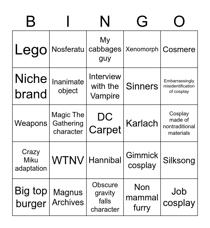 This bingo card has a free space and 24 words: WTNV, Magnus Archives, Interview with the Vampire, Big top burger, Cosmere, Lego, Niche brand, Nosferatu, Karlach, Hannibal, Sinners, Weapons, Gimmick cosplay, Silksong, Inanimate object, Non mammal furry, Cosplay made of nontraditional materials, My cabbages guy, Embarrassingly misidentification of cosplay, Magic The Gathering character, Job cosplay, Crazy Miku adaptation, Xenomorph and Obscure gravity falls character.