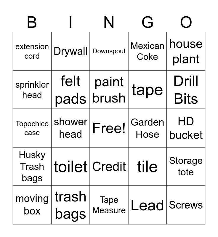 This bingo card has a free space and 26 words: Credit, Lead, paint brush, trash bags, house plant, extension cord, sprinkler head, Drywall, HD bucket, tile, tape, Topochico case, Storage tote, moving box, shower head, 2x4, Mexican Coke, Husky Trash bags, Downspout, Screws, Drill Bits, Tape Measure, Garden Hose, toilet, felt pads and laundry soap.