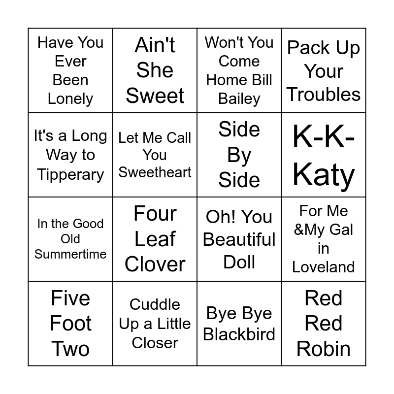 This bingo card has 31 words: If You knew Susie, Shine On Harvest Moon, For Me &My Gal in Loveland, Heart of my Heart, Have You Ever Been Lonely, Won't You Come Home Bill Bailey, Side By Side, Darktown Strutters' Ball, Cuddle Up a Little Closer, Let the Rest of the World Go By, Bye Bye Blackbird, Five Foot Two, If You Were the Only Girl in the World, When You're Smiling, Four Leaf Clover, Sentimental Journey, Memories, There are Smiles, Red Red Robin, Little Brown Jug, It's a Long Way to Tipperary, Hello My Baby, Put Your Arms Around Me Honey, Ain't She Sweet, In the Good Old Summertime, Let Me Call You Sweetheart, Pack Up Your Troubles, Oh! You Beautiful Doll, There's a Long, Long Trail, K-K-Katy and When You Wore a Tulip.