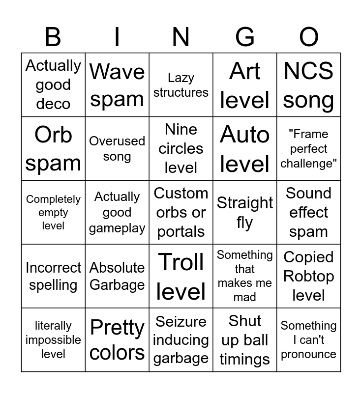 This bingo card has 25 words: Absolute Garbage, Seizure inducing garbage, Nine circles level, literally impossible level, NCS song, Actually good deco, Orb spam, Wave spam, Straight fly, Troll level, Auto level, Completely empty level, Something that makes me mad, Copied Robtop level, Overused song, Something I can't pronounce, Sound effect spam, Lazy structures, "Frame perfect challenge", Actually good gameplay, Custom orbs or portals, Pretty colors, Incorrect spelling, Art level and Shut up ball timings.
