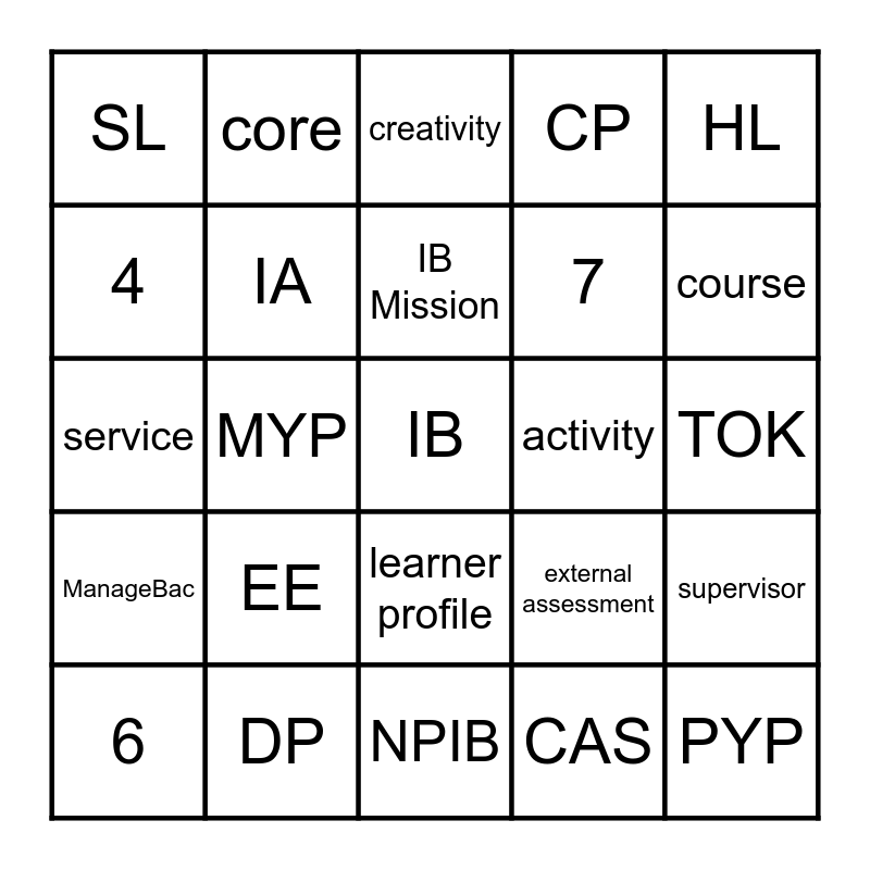 This bingo card has a free space and 24 words: EE, DP, IB Mission, 6, HL, SL, 4, core, activity, learner profile, 7, service, external assessment, supervisor, IA, CAS, TOK, creativity, course, MYP, PYP, ManageBac, CP and NPIB.