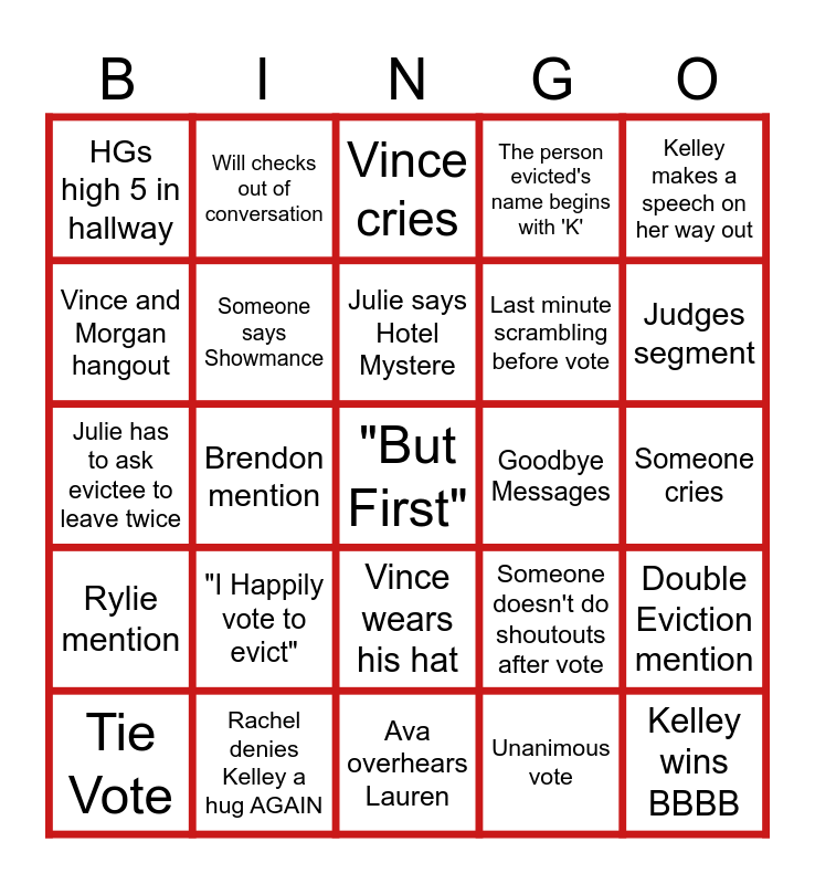 This bingo card has a free space and 44 words: Ava wins BBBB, Kelley wins BBBB, Katherine wins BBBB, Tie Vote, Kelley makes you cringe, Unanimous vote, Vince cries, Julie's hair is up, Kelley makes a speech on her way out, Rachel denies Kelley a hug AGAIN, The person evicted's name begins with 'K', Goodbye Messages, Vince wears his hat, "I Happily vote to evict", "I sadly vote to evict", Ava overhears Lauren, Will wears sunglasses, Julie has to ask evictee to leave twice, Tech issue, Judges segment, Will checks out of conversation, Julie wears a dress, Rachel has open shoulder gown, HGs high 5 in hallway, Keanu and Vince in the Gym segment, Someone cries, Someone says big boy pants, Someone shouts out Kelsey on behalf of Vince while voting, Someone doesn't do shoutouts after vote, Rylie mention, HoH preview, Double Eviction mention, New Twist revealed, Mastermind Appearance, Brendon mention, Rachel's kids mentioned, Kelley starts a chant, 'Chocolate Drop', Julie says Hotel Mystere, Vince and Morgan hangout, Last minute scrambling before vote, Someone says 750,000 dollars, Someone says Showmance and HGs talk in DR hallway.