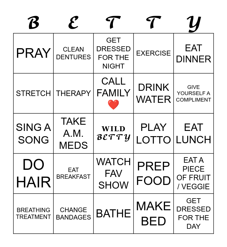 This bingo card has a free space and 24 words: EAT BREAKFAST, CHANGE BANDAGES, CALL FAMILY ❤️, BREATHING TREATMENT, EAT DINNER, PRAY, STRETCH, CLEAN DENTURES, PLAY LOTTO, WATCH FAV SHOW, DRINK WATER, SING A SONG, PREP FOOD, EAT A PIECE OF FRUIT / VEGGIE, THERAPY, MAKE BED, EAT LUNCH, GET DRESSED FOR THE NIGHT, GIVE YOURSELF A COMPLIMENT, TAKE A.M. MEDS, GET DRESSED FOR THE DAY, DO HAIR, EXERCISE and BATHE.