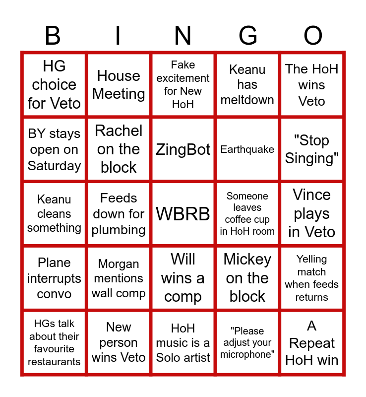 This bingo card has a free space and 64 words: Keanu wins HoH, Rachel betrayed by Keanu, Judges have a meeting, Yelling match when feeds returns, 3 Women otb, New Alliance, House Meeting, "I'm not gonna put you up", ZingBot, Morgan wins a comp, Will wins a comp, Vince Cries, Vince plays in Veto, The HoH wins Veto, M&M, BY stays open on Saturday, Feeds down for plumbing, HG choice for Veto, No HNs for the week, Earthquake, Morgan mentions wall comp, Plane interrupts convo, Keanu has meltdown, Slip and Slide mention, Vorgan, Keanu and Rachel in the Gym, Talk about ants, Rachel studies days with props, ALCOHOL!, Adrian Mention, Final 2 deal mentioned, Nominee wins the Veto, Will's wife mentioned, New "Gate", "Stop Singing", HGs talk about their favourite restaurants, Ashley has a good read, "Please adjust your microphone", Game night, Rachel on the block, Keanu cleans something, Someone leaves coffee cup in HoH room, HoH sleepover, Feeds down longer than 4 hours, A Brand new first time HoH win, A Repeat HoH win, New person wins Veto, Skippy forgets to switch from Pets, Mickey on the block, Ava in bed, Double Eviction talk, Lauren says "I dont know", HoH music is a Solo artist, Rachel and Vince convo in the storage room, iPod is back, Cam talk, Fake excitement for New HoH, HG states an incorrect fact about last season, A former winner (Not Rachel) is mentioned, Talk about cleaning, Eavesdropping, HoH letter is from a sibling, "I dont want ___ in the jury" and Unlikely alliance is formed.