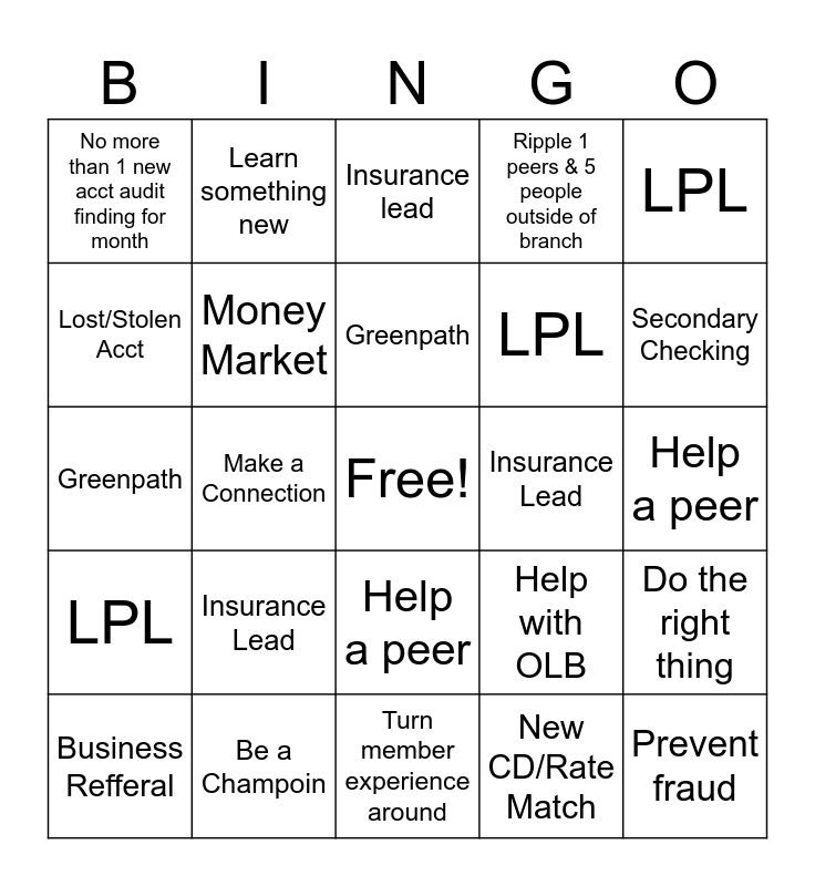 This bingo card has a free space and 24 words: Insurance Lead, Be a Champoin, Greenpath, Business Refferal, LPL, No more than 1 new acct audit finding for month, Lost/Stolen Acct, Learn something new, Insurance Lead, Help a peer, LPL, Greenpath, Help with OLB, Do the right thing, Money Market, New CD/Rate Match, Help a peer, Insurance lead, Secondary Checking, Make a Connection, Prevent fraud, LPL, Ripple 1 peers & 5 people outside of branch and Turn member experience around.