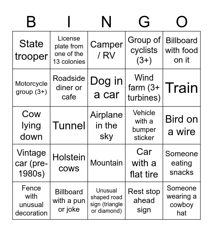 This bingo card has 42 words: Free!, Dog in a car, Construction ahead sign, Holstein cows, Rest stop ahead sign, Someone eating snacks, Airplane in the sky, Someone wearing sunglasses, Camper / RV, Mountain, Bird on a wire, Train, Tunnel, Billboard with food on it, Bridge with graffiti, Car with a flat tire, Car with bikes on the back, Cow lying down, Sports car, License plate from one of the 13 colonies, Motorcycle group (3+), Roadside attraction sign, Someone wearing a cowboy hat, State trooper, Tesla, Water tower, Wind farm (3+ turbines), Vehicle with a broken window or missing mirror, Trailer full of animals, Vehicle with a roof rack full of luggage, Car carrying a kayak or canoe, Vintage car (pre-1980s), Roadside diner or cafe, Unusual shaped road sign (triangle or diamond), Person jogging on the shoulder, Fence with unusual decoration, Billboard with a pun or joke, Vehicle with a bumper sticker, Emergency vehicle with lights on, Tractor with equipment, Group of cyclists (3+) and Wildlife crossing sign that’s not deer.