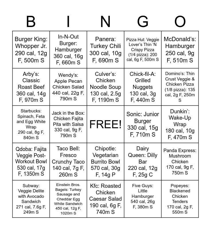 This bingo card has a free space and 25 words: Taco Bell: Fresco Crunchy Taco 140 cal, 7g F, 260m S, Kfc: Roasted Chicken Caesar Salad 190 cal, 6g F, 740m S, Culver’s: Chicken Noodle Soup 130 cal, 2.5g F, 1190m S, Subway: Veggie Delite with Avocado Sandwich 271 cal, 7.6g F, 249m S, McDonald’s: Hamburger 250 cal, 9g F, 510m S, Burger King: Whopper Jr. 290 cal, 12g F, 500m S, Arby’s: Classic Roast Beef 360 cal, 14g F, 970m S, In-N-Out Burger: Hamburger 360 cal, 16g F, 660m S, Sonic: Junior Burger 330 cal, 15g F, 710m S, Chipotle: Vegetarian Burrito Bowl 570 cal, 30g F, 14g P, Chick-fil-A: Grilled Nuggets 130 cal, 3g F, 440m S, Starbucks: Spinach, Feta and Egg White Wrap 290 cal, 8g F, 840m S, Dairy Queen: Dilly Bar 220 cal, 12g F, 25g C, Panda Express: Mushroom Chicken 170 cal, 9g F, 750m S, Wendy’s: Apple Pecan Chicken Salad 440 cal, 22g F, 790m S, Hardee’s: Original Hot Ham ‘N Cheese 280 cal, 12g F, 1140m S, Dunkin’: Wake-Up Wrap 180 cal, 10g F, 470m S, Panera: Turkey Chili 300 cal, 10g F, 690m S, Domino’s: Thin Crust Veggie & Chicken Pizza (1/8 pizza): 135 cal, 2g F, 250m S, Jack in the Box: Chicken Fajita Pita with Salsa 330 cal, 9g F, 790m S, Popeyes: Blackened Chicken Tenders 170 cal, 2g F, 550m S, Einstein Bros. Bagels: Turkey Sausage and Cheddar Egg White Sandwich 450 cal, 12g F, 1020m S, Qdoba: Fajita Veggie Post-Workout Bowl 530 cal, 17g F, 1350m S, Pizza Hut: Veggie Lover’s Thin ‘N Crispy Pizza (1/4 pizza): 200 cal, 6g F, 500m S and Five Guys: Little Hamburger 540 cal, 26g F, 380m S.